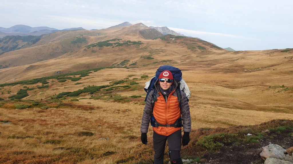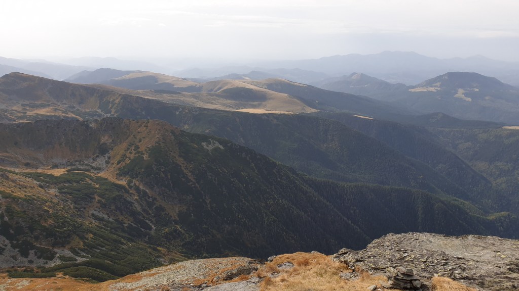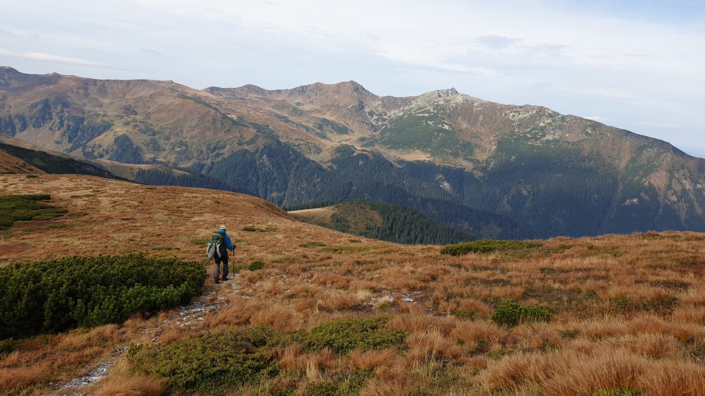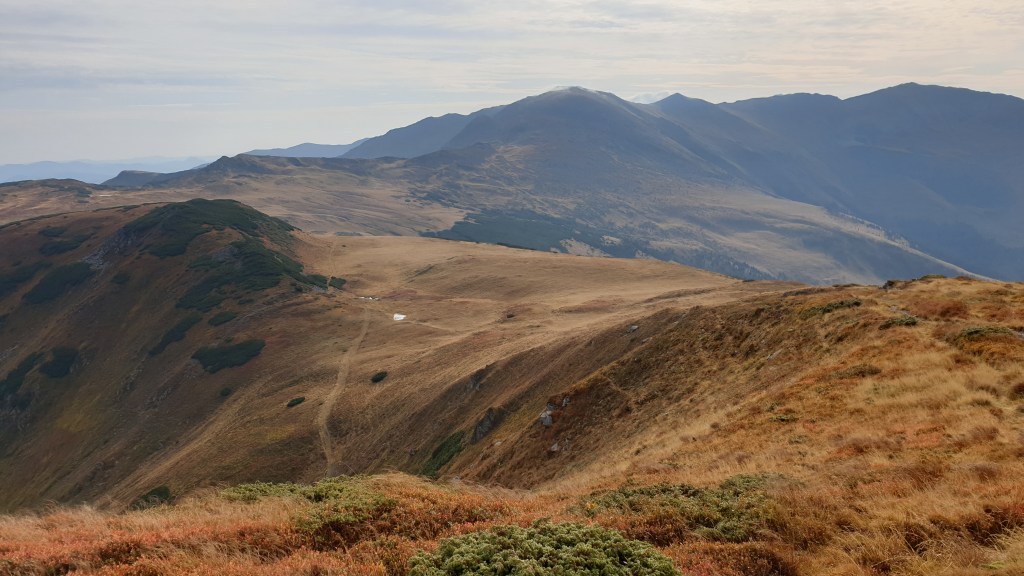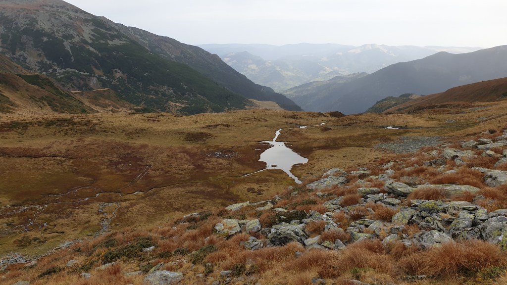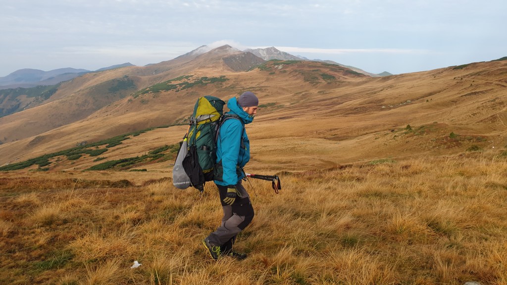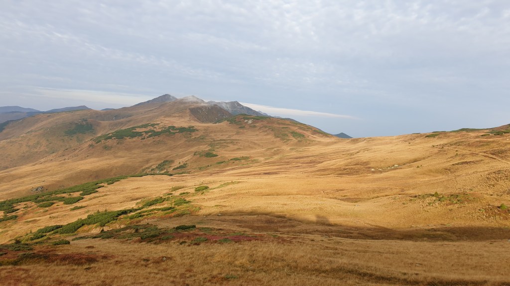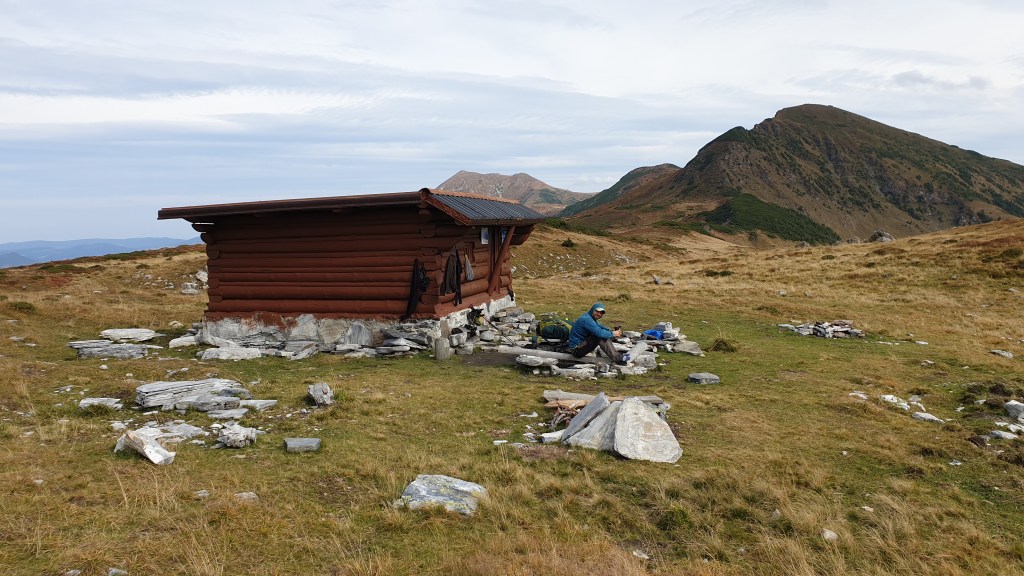 Jemy śniadanie sycąc oczy widokami i… I musimy założyć wilgotne ciuchy i przemoczone buty. Rozważamy poddanie wyprawy bojąc się o nasze zdrowie. Po drodze jednak silny wiatr szybko suszy ubrania, a pogoda się stabilizuje; idziemy dalej. Wędrujemy połoninami, wąskimi graniami, trochę takie Bieszczady na 2000m. Na szlaku znajdujemy kolejny schron. Jest nim nowiusieńki domek, w którym można znaleźć pozostawione przez traperów jedzenie, a dodatkowo zadbał ktoś o literaturę. W plastikowych pudłach umieszczono sporo numerów National Geographic, przewodników i albumów z rumuńskich parków. Choć jest dopiero przed 14.00 postanawiamy zostać tu na noc, bo okolica jest przepiękna.