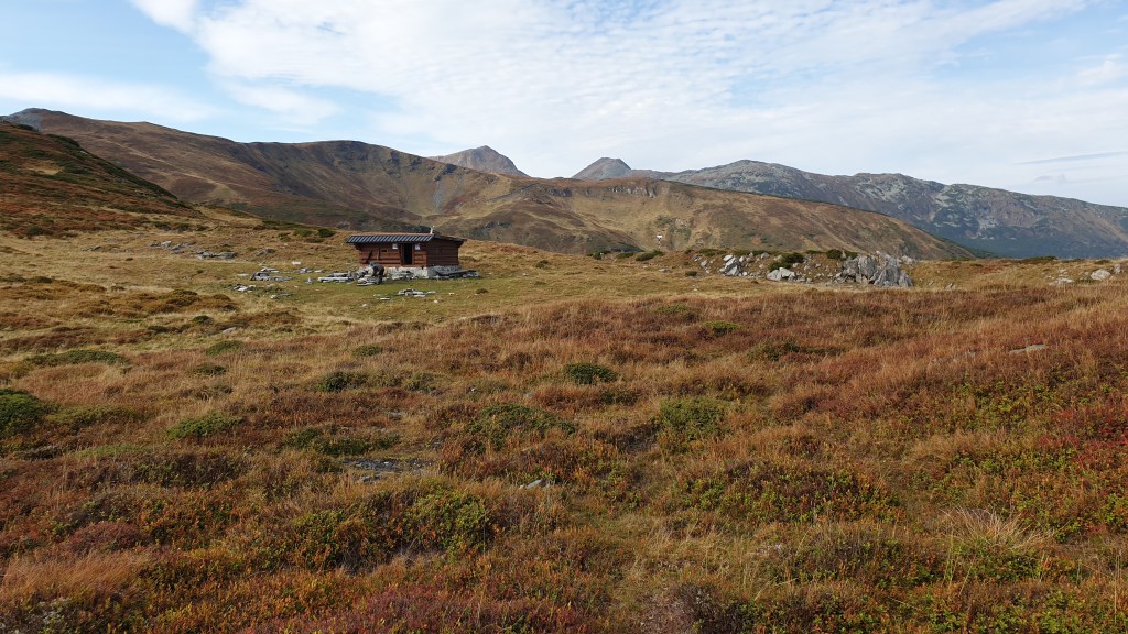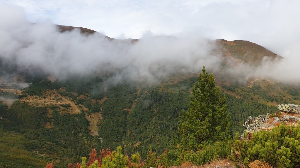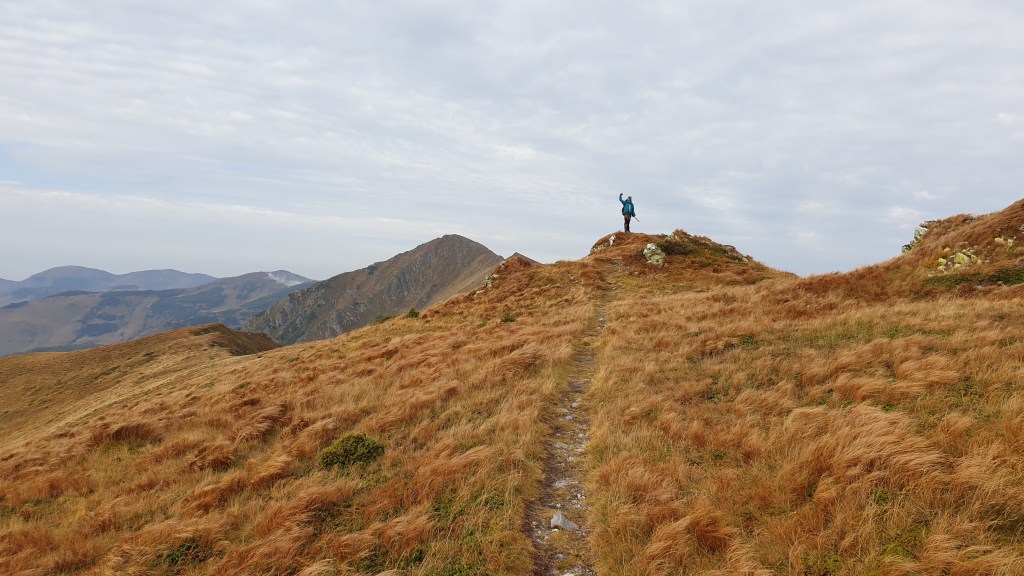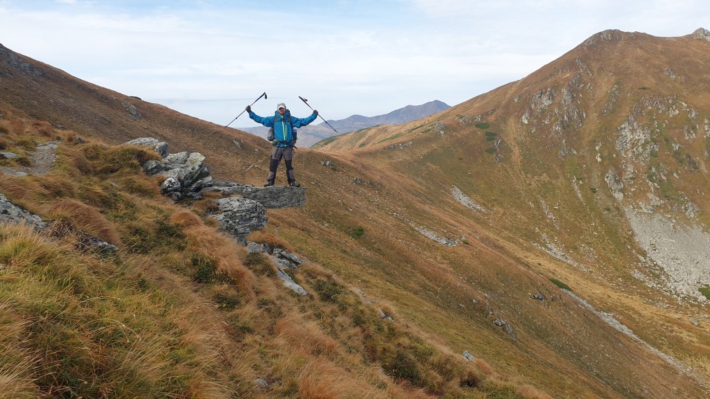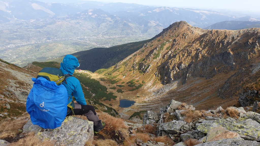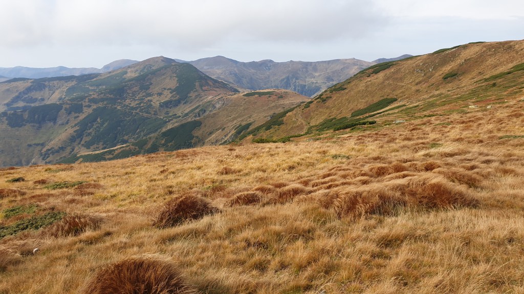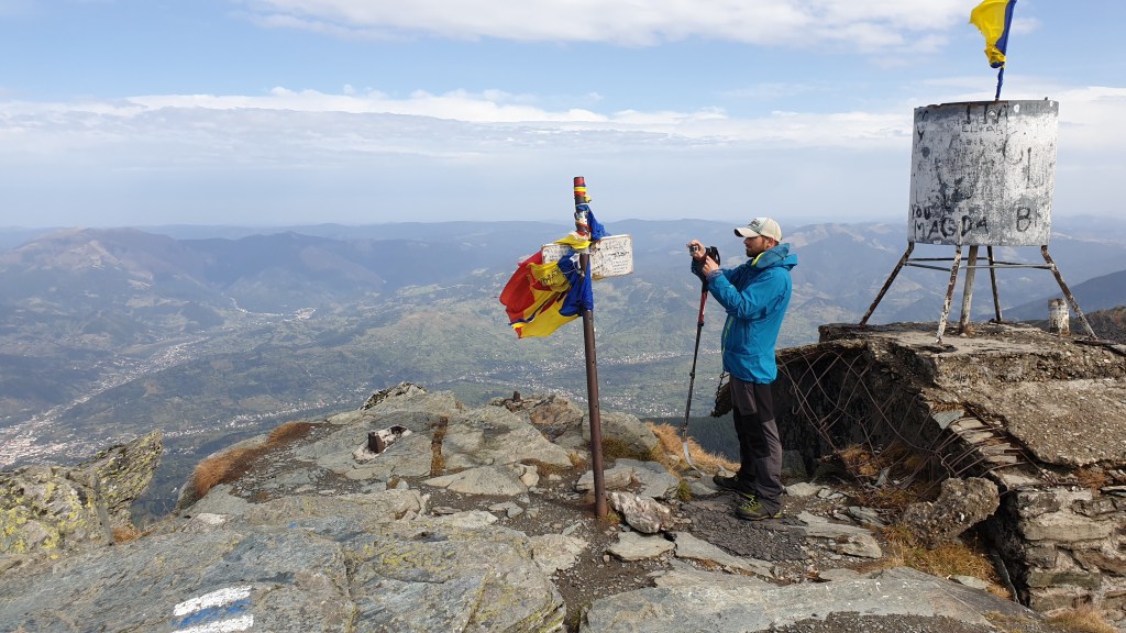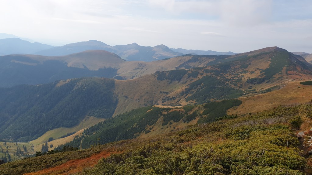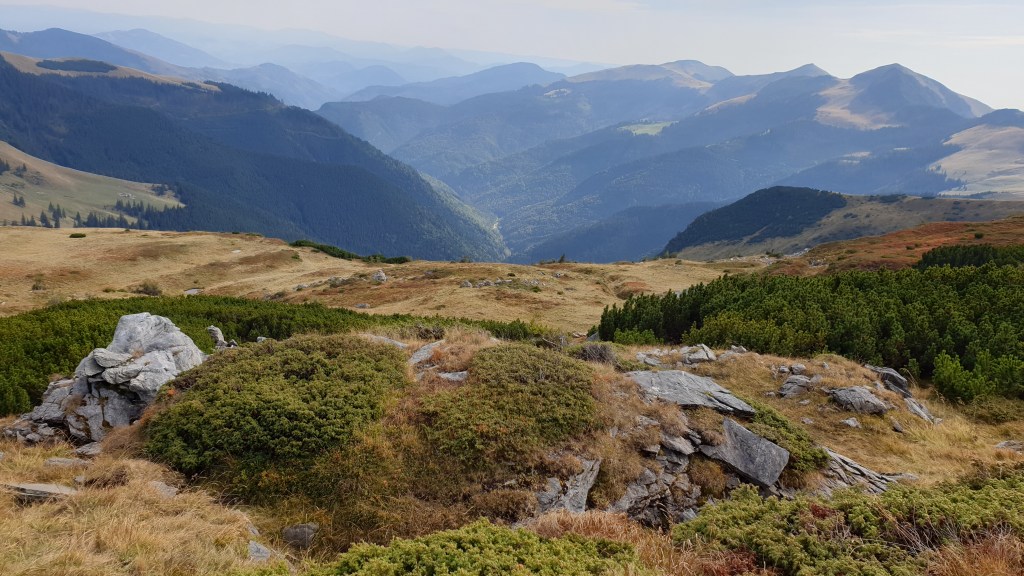 Jemy śniadanie sycąc oczy widokami i… I musimy założyć wilgotne ciuchy i przemoczone buty. Rozważamy poddanie wyprawy bojąc się o nasze zdrowie. Po drodze jednak silny wiatr szybko suszy ubrania, a pogoda się stabilizuje; idziemy dalej. Wędrujemy połoninami, wąskimi graniami, trochę takie Bieszczady na 2000m. Na szlaku znajdujemy kolejny schron. Jest nim nowiusieńki domek, w którym można znaleźć pozostawione przez traperów jedzenie, a dodatkowo zadbał ktoś o literaturę. W plastikowych pudłach umieszczono sporo numerów National Geographic, przewodników i albumów z rumuńskich parków. Choć jest dopiero przed 14.00 postanawiamy zostać tu na noc, bo okolica jest przepiękna.