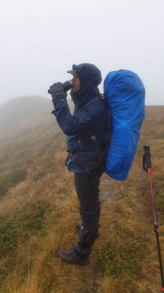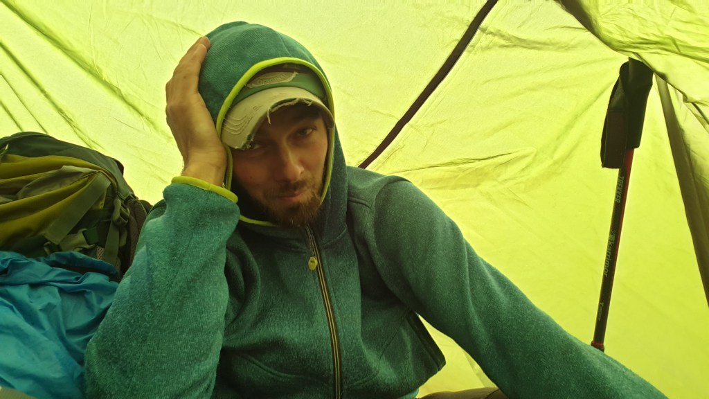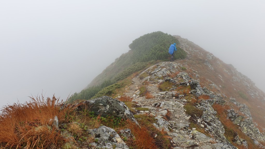 Ciężko wyjść ze śpiwora, bo na zewnątrz ciągle wieje i leje. Ciepła kawa i ruszamy dalej. Wiatr jest silniejszy niż wczoraj, na grani mamy wrażenie, że zepchnie nas w mglistą otchłań. Drobinki lodu sieką nas po policzkach. Widoczność na kilkanaście metrów a Maniek idzie przodem i co chwila wali kijkiem o kijek, by spłoszyć ewentualnego niedźwiedzia.