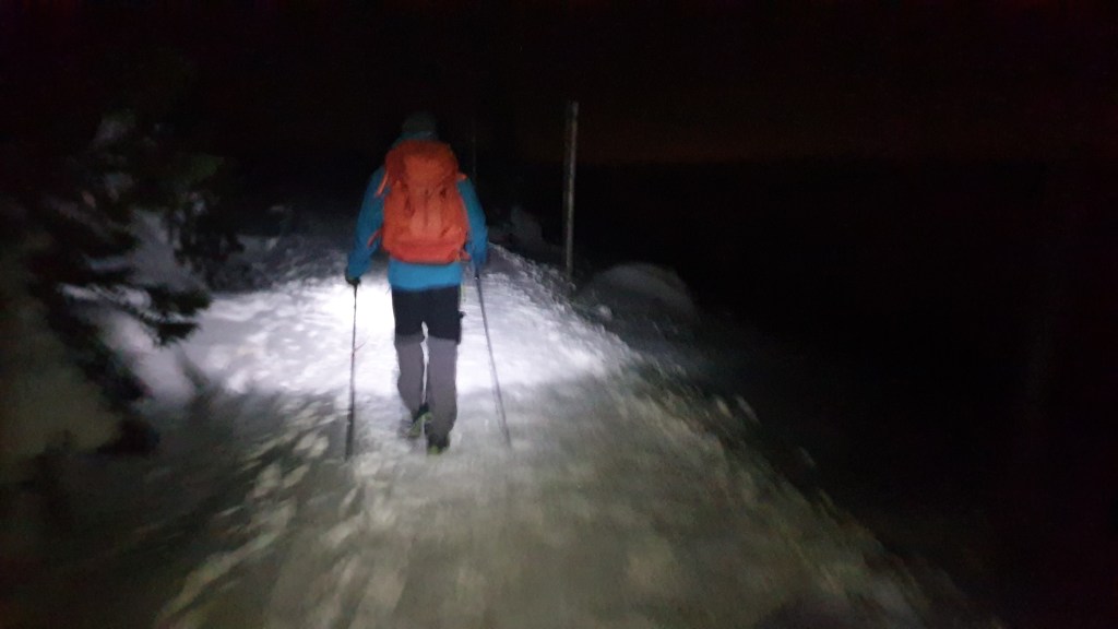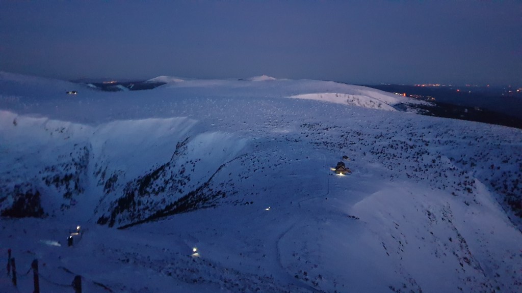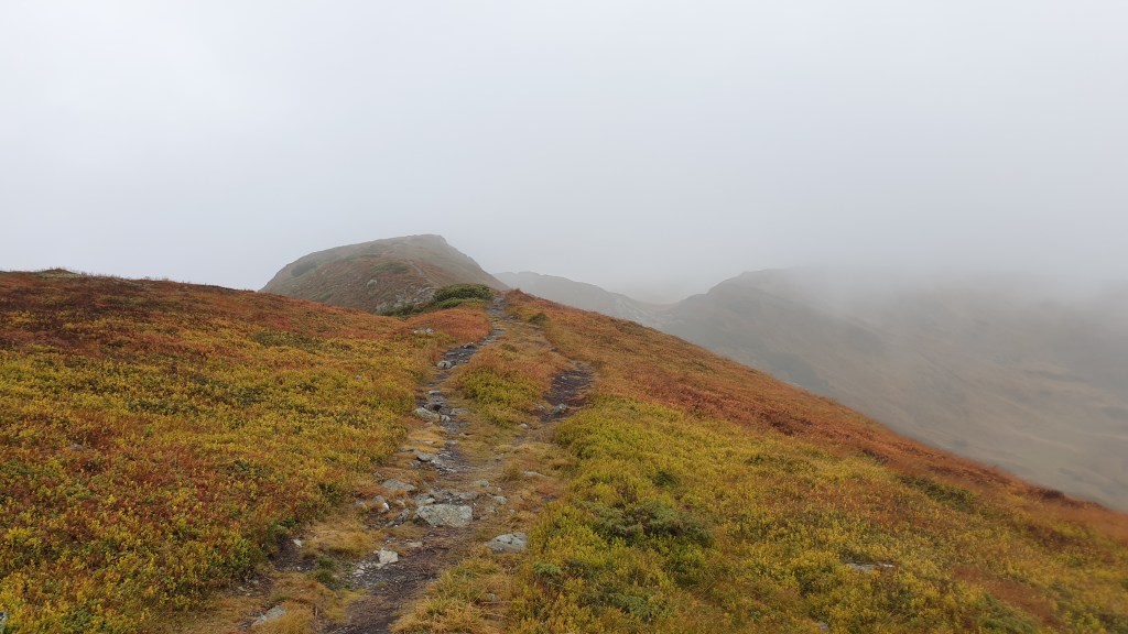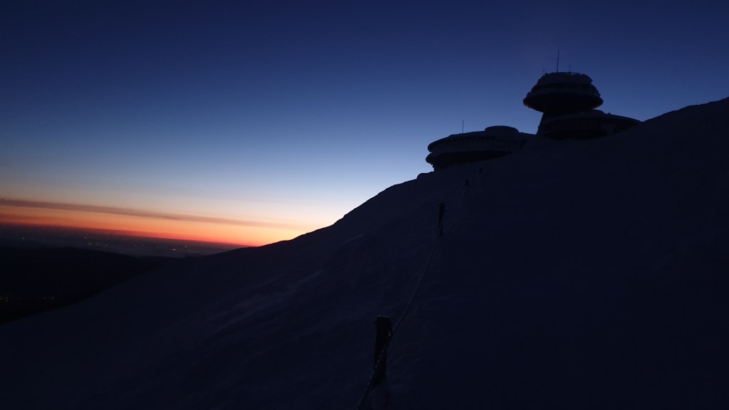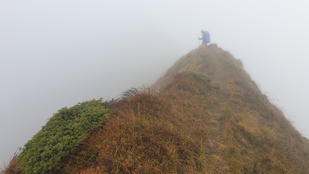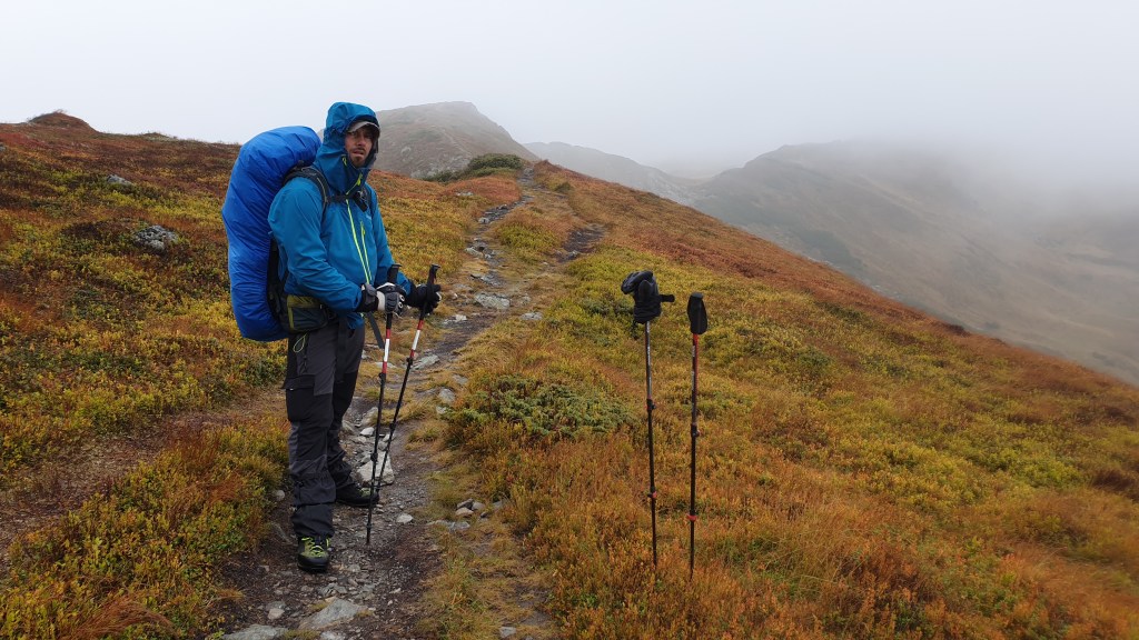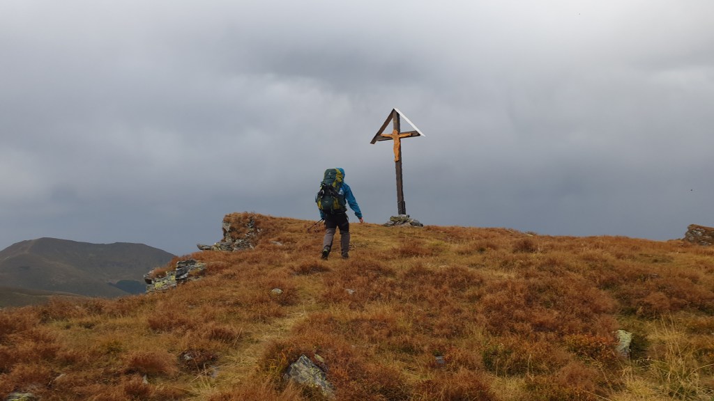 Mijają pierwsze godziny, a my idziemy ciągle we mgle. Prognozy są nieciekawe. W południe na moment podnoszą się chmury ukazując nam początek grani, którą będziemy szli kilka dni. Podchodzimy na szczyt Ineut 2279m, zaczyna padać marznący deszcz, a pod butami pojawia się śnieg, dzieła dopełnia silny wiatr. Jesteśmy już zmęczeni, 20 kilogramowe plecaki zaczynają nas wbijać w ziemie. Na 18 kilometrze znajdujemy schron, w którym zostajemy na noc.